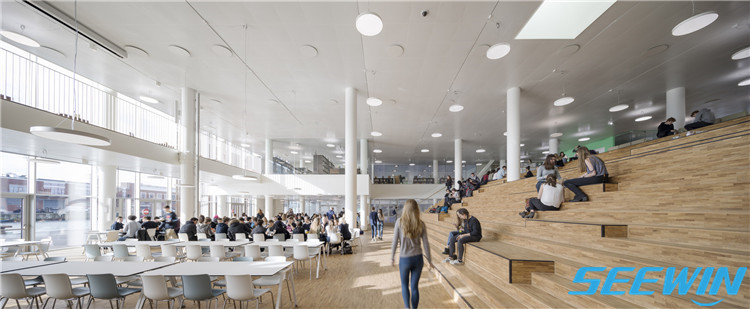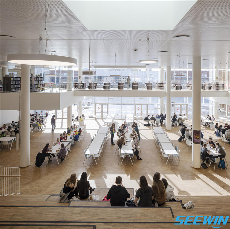 學校簡介:哥本哈根國際學校位于哥本哈根新的 Nordhavn 區的一個重要位置。它占地2.5萬平方米,是哥本哈根最大的學校,可容納1,200名學生和280名教職工。四個單元都建在一樓的基地之上,這個一樓所容納的活動更為常見和外向,包括一個大廳、食堂、圖書館和各種體育、表演設施。因此,教室可以在休息時間關閉,而公共區域仍將保持開放,以供舉行學校和當地的活動。小編將為您展示這所國際學校餐廳家具的配置方案。