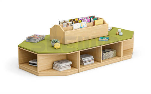 產品采用 E0 級 MFC 板與軟包結合,綠色環保。整體多變形設計,創意造型,加強學生閱讀興趣??勘耻洶问剑m合圖書館等區域使用。